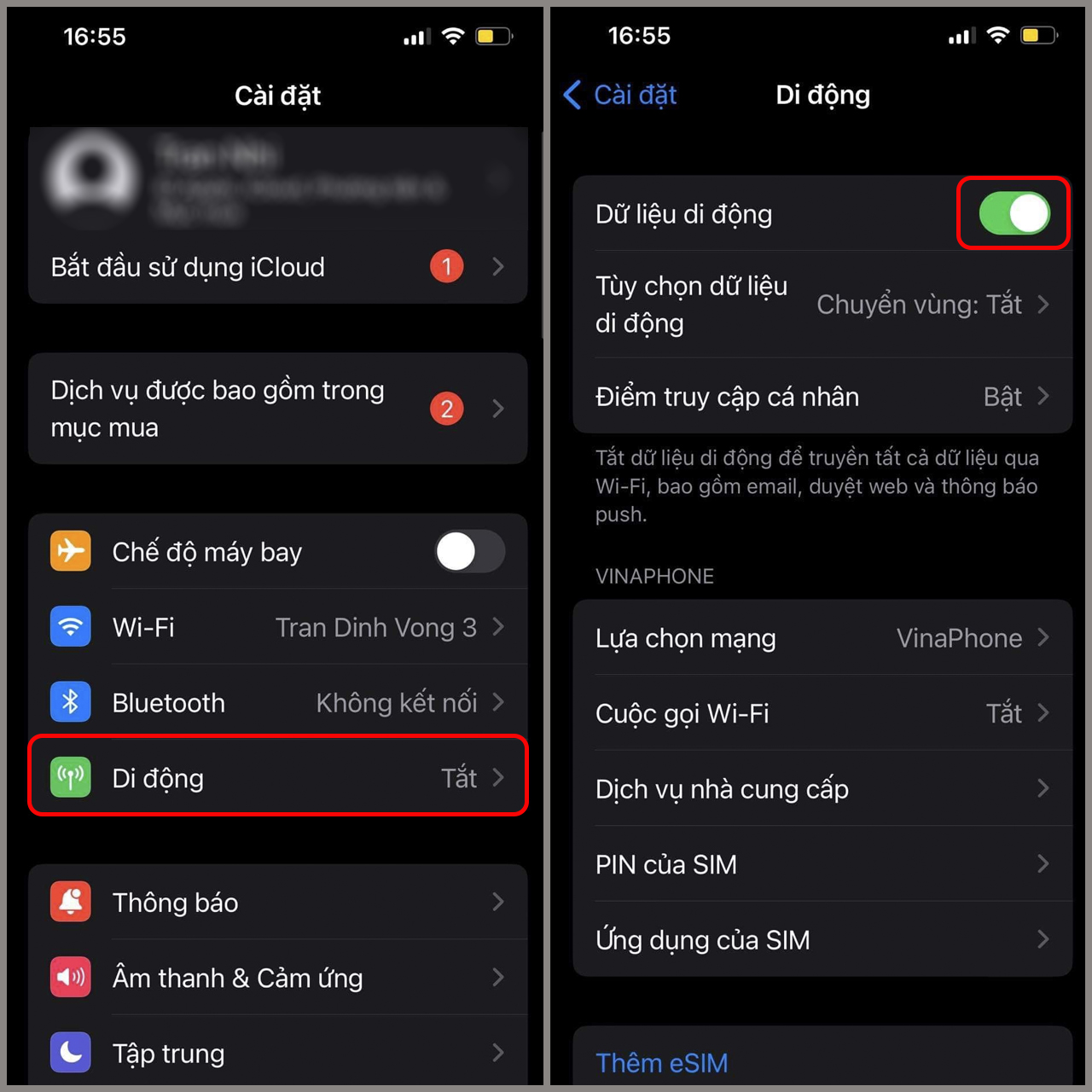 - B2: Bật Dữ liệu di động.