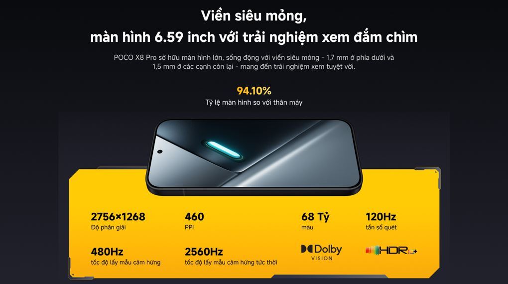 Poco X8 Pro sở hữu màn hình AMOLED 1.5K (6,59 inch) với tần số quét 120Hz.